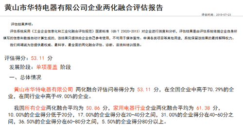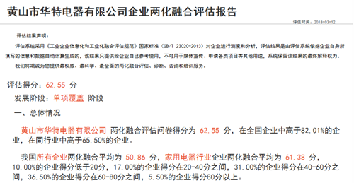 (图为连续4年,黄山市华特电器有限公司在安徽省两化融合评估系统中开展自评估和诊断,以GB/T23020-2013标准为公司两化融合建设的索引,这在全省、乃至全国的中小企业发展过程中是为数不多的)
