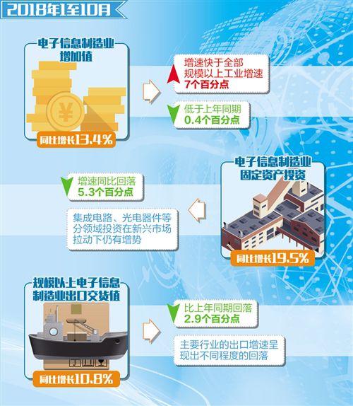 2018年,对于我国电子信息制造业来说是不平凡的一年。这一年,全球传统消费电子市场疲软不振,产业发展不确定性持续上升,我国电子信息制造业可谓迎难而上谋发展。数据显示,2018年1月份至10月份,规模以上电子信息制造业增加值同比增长13.4%,增速快于全部规模以上工业增速7个百分点。