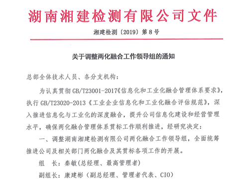 日前,在省工信厅相关部门领导的支持下,湖南湘建检测有限公司召开两化融合管理体系贯标推进大会。国家工信部、湖南省工信厅批准的两化融合管理体系贯标咨询机构---安徽省新世纪认证咨询有限责任公司贯标咨询团队,进驻辅导。