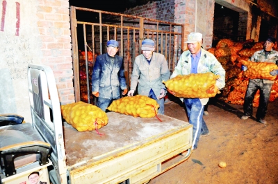 土豆地窖里的工人正在将一麻袋一麻袋的土豆运到停在地窖门前的邮政运输车上,通过网络销往全国各地。
