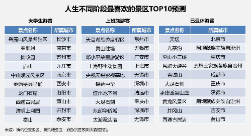 从正处在不同人生阶段的游客偏好预测来看,大学生群体喜欢看山看水,岳麓山、庐山、泰山的游客中将布满“天之骄子”,象牙塔的学子或许更喜欢在旅游中“指点江山激扬文字”。而平日忙碌的上班族则倾向于去度假区放松一下身心,或是到野生动物园看珍稀野兽、听虎啸狮吼,抑或深入影视基地体验一把“人生如戏,全靠演技”。相比之下,没有工作、生活压力的退休一族,则喜欢在历史景区中品味经典,在峡谷穿梭中感怀人生。