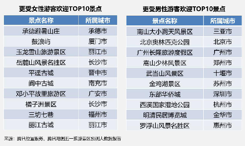 根据《报告》对于旅游人群预测,女性游客最感兴趣的景点是承德避暑山庄,岳麓山、平遥古城、阆中古城等古城古镇类景点,以及厦门、丽江等“文青”气质更浓的城市。相比而言,男性游客更青睐的景点类型则更加多样化,既爱嵩山少林寺、武当山这样的“侠客游”,也爱感受大小洞天的道教文化,有的则喜欢北京奥林匹克公园、广州长隆度假区、深圳华侨城等人文乐园景区。