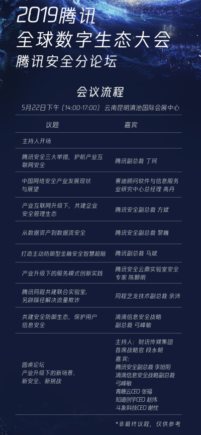 除此之外,在哪些行业还将看到腾讯安全的身影?5月22日,同程艺龙、滴滴等企业代表将来到腾讯安全分论坛现场,分享与腾讯安全联手打造的垂直场景解决方案,为相应行业的安全发展提供参考。滴滴、青藤云、知道创宇、斗象科技的安全大佬还将围绕“产业升级下的新场景、新安全、新挑战”带来观点碰撞。