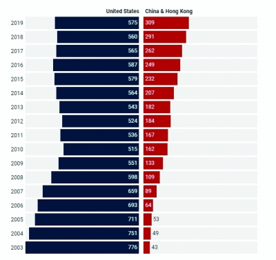 《福布斯》指出,当前的这一局面与2003年《福布斯》首次发布全球企业2000强榜单时的情况大相径庭,彼时,美国上榜企业776家,中国内地及中国香港仅有43家。