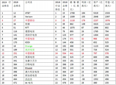 《福布斯》2019年度“全球上市公司2000强”榜单通信服务业子榜单(节选)