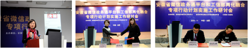 会议最后,安徽省决策文化交流中心与合肥市两化融合公共信息服务 平台签订了合作备忘录;与太和经济开发区签订了微信政务通平台建设协 议,标志着安徽省政务微信平台建设迈出了坚实的一步。