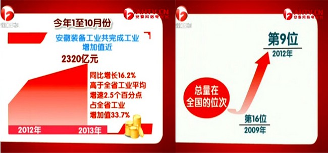 在12月7日安徽卫视新闻联播播出的 “安徽昂首迈向装备制造业强省” 头条新闻报道中,我委牛弩韬主任接受了采访。牛主任在受访时说:“今年到目前为止,我们的装备制造业这块,大行业来说,今年产值将突破一万亿,是安徽省第一个率先突破万亿的行业,下一步发展主要就是从智能方面发展,我们要走两化融合的道路,特别是信息技术和装备企业结合起来来提升它的智能水平。”详见以下链接: