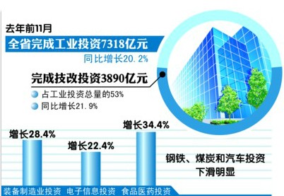 主导产业增长较快,投资结构不断优化。去年前11月,全省装备制造业完成工业投资 1985亿元,增长28.4%,总量占到全省制造业的27%,完成技改投资 998亿元,增长20.3%;