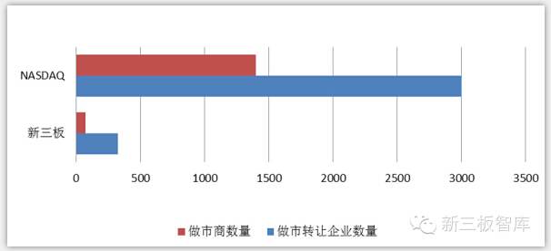新三板做市转让企业大部分做市商数为3—5家,只有少部分企业做市商超过十家,而NASDAQ平均一家企业的做市商为12家,竞争性做市商制度下,增加单个企业做市商数量,有利于增加股票流动性,减少买卖报价差额,提供给投资者合理股票估值。