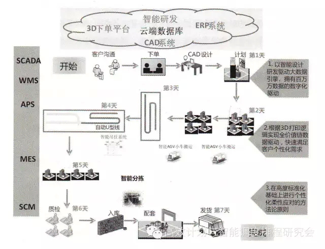 通过移动互联网+订购一个定制化的产品,通过云ERP+进行模块化选配,APS制造模块化算法优化自组合,按照需要WMS的精益化JIT/JIS模块化智能配送喂料,MES智能调度工厂组装优化组合,物与物、人与物、物与料、系统之间的连接并对产生的工业大数据包括结构化工艺数据与非结构化客户社交化感知数据,进行海量的云计算,在不同的价值链的位置场景化最优规则选择,对插单等变化自动调整自组合,在最短的时间内交给客户并通过SCM运输给客户预期并提供IoTs场景化服务。