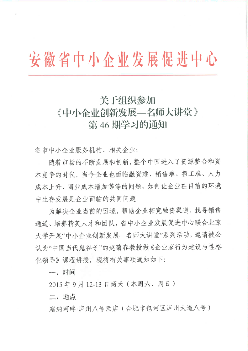 关于组织参加《中小企业创新发展—名师大讲堂》第46期学习的通知
