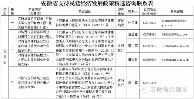 条文出处:《安徽省人民政府关于促进经济持续健康发展的意见》(皖政〔2015〕51号)、《安徽省人民政府办公厅关于修订印发实施创新驱动发展战略进一步加快创新型省份建设配套文件的通知》(皖政办〔2015〕40号)、《安徽省人民政府办公厅关于发展众创空间推进大众创新创业的实施意见》(皖政办〔2015〕41号)