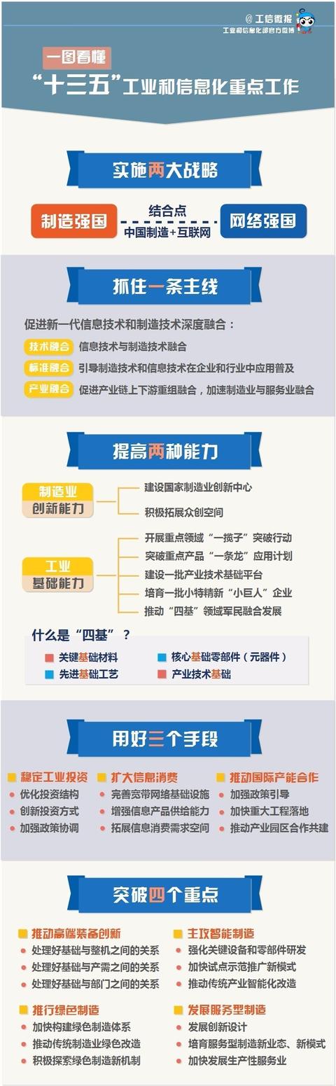 关于“十三五”工业和信息化发展,党中央、国务院已做出一系列重大战略部署。为帮助大家简明扼要地把握“十三五”工业和信息化发展战略部署、主要思路和重点工作,小编根据有关资料制作了下图,主要从“制造强国”角度对其进行了解读。