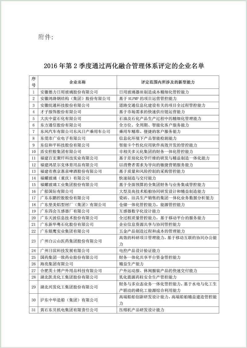 中国两化融合服务联盟关于公布2016年第2季度通过两化融合管理体系评定企业名单的通告