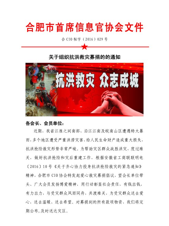 【安徽CIO联盟】关于组织抗洪救灾募捐的的通知