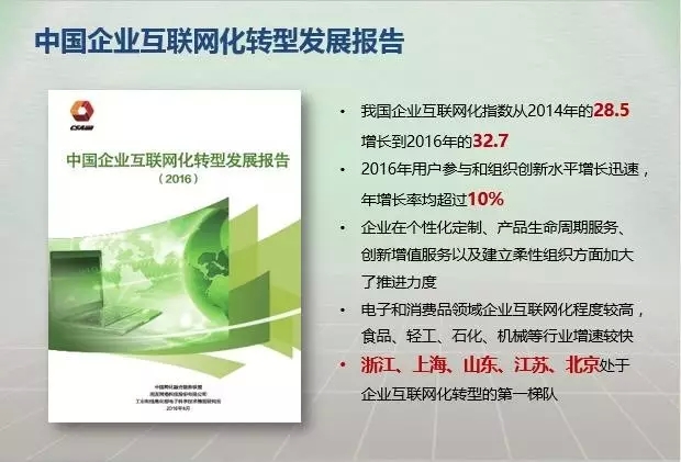第三个报告是中国企业互联网化转型发展研究报告。通过报告我们看到我国企业互联网化指数从2014年的28.5%增长到2016年的32.7%,2016年用户参与和组织创新水平增长迅速,年增长率均超过10%,企业在个性化定制、产品生命周期服务、创新增殖服务以及建立柔性组织方面加大了推进力度。电子和消费品领域企业互联网化程度较高,食品、轻工、石化、机械等行业增速较快。从地域分布来看,浙江、上海、山东、江苏、北京是处于企业互联网化转型第一梯队。