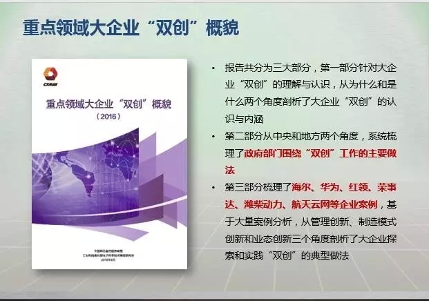 最后一个报告是重点领域大企业“双创”概貌。基于大量的案例分析对大企业双创典型模式进行了剖析,我们这个报告分为三个部分:第一部分是对大企业双创理解和认识,从为什么和是什么两个角度分析大企业双创的内涵,第二从中央和地方两个角度系统梳理政府部门围绕双创工作主要的做法,第三部分梳理了大型的典型的企业比如说海尔、华为、红领、荣事达等企业案例,分析大企业探索和实践双创的典型做法。