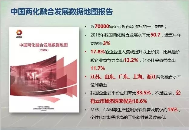 第一个是中国两化融合发展的数据地图,这是年度评估报告的升级版,在怀进鹏副部长的亲自指导下完成的,通过全国31个省全面推广企业两化融合评估诊断和对标的工作,积累了一手的数据,报告全面剖析了31个省和13个重点行业的状况,价值成效以及特征模式等等,能够真实的反映出各个地区行业规模、生产类型企业的两化融合发展水平,也可以客观描述出两化融合全景地图。从报告当中可以得到2016年我们国家的两化融合发展水平是50.7%,近5年的平均增长率是3%,17.8%企业进入集成提升以上的阶段,比其他阶段企业竞争力高出13.2%,经济效益高出11.7%,江苏、山东、广东、上海、浙江两化融合水平名列前五,我国企业云平台应用率为33.5%,不足四成,MES、CAM等生产控制类软件普及度仅有15%,这是数据地图的情况。
