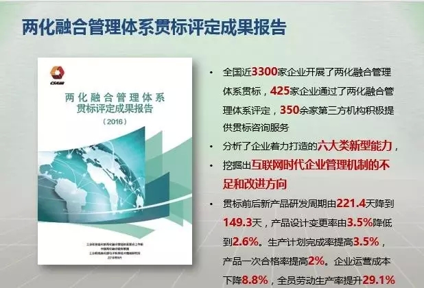 第二个报告是两化融合管理体系贯标评定成果报告。全国近3300家企业开展了两化融合管理体系贯标,425家企业通过了两化融合管理体系评定,350家第三方机构提供贯标咨询服务。在这个报告里面分析了企业打造的六大新型能力,挖掘了互联网时代企业管理机制的不足和改进方向,通过贯标对企业的核心竞争力有一个持续提升,我们贯标前后企业新产品研发周期是由221.4天降低到149.3天,研发周期加速,产品设计变更率3.5%降到2.6%,生产计划完成率提高了3.5%,产品一次性的合格率提高了2%,企业运营成本下降8.8%,全员劳动生产率提升29.1%。