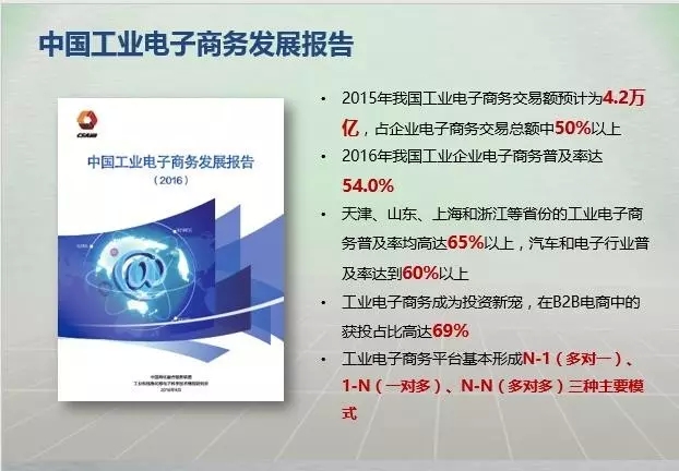 第四个报告是中国工业电子商务发展报告。这个报告主要反映了2015到2016年中国工业电子商务发展情况综合性的研究,对我们国家电子商务的发展趋势和热点都进行了分析和描述,在报告中我们可以看到2015年我国工业电子商务整个的交易额大约是4.2万亿,占企业电子商务交易总额的50%以上,工业电子商务还是占有量比较多,2016年工业企业电子商务的普及率达到50以上,天津、山东和上海浙江等省份工业电子商务普及率达到65%以上,汽车和电子行业普及率达到60%以上,工业电子商务成为投资新宠、在B2B电商中获投占比达到69%。在构建阳光购销体系,共生共赢的电子商务圈中也发挥着重要的作用。