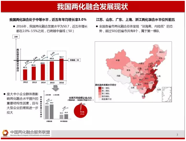 首先是我们国家2016年两化融合整体水平是50.7,国家最先进的企业达到80多分,平均水平是跨过中值线。
