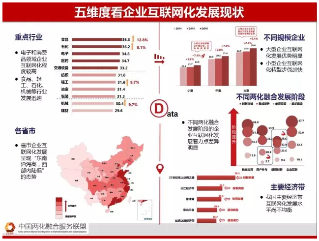 工信部电子一所信息化研究与促进中心副主任陈杰解读《2016年中国两化融合数据地图》、《中国企业互联网化转型发展报告》,分析我国两化融合和企业互联网化转型发展现状和特点—— 两化融合数据地图是我国两化融合的全景图,源于我们从2009年开始做两化融合的评估诊断,获得的数据从一开始几十个行业,到现在有近7万家近百项数据,从中能够分析出全国不同点线面的发展现状以及存在问题。所以,形成了两化融合发展的全景图。 企业互联网化报告基于数据分析,希望成为企业互联网化的风向标和晴雨表。