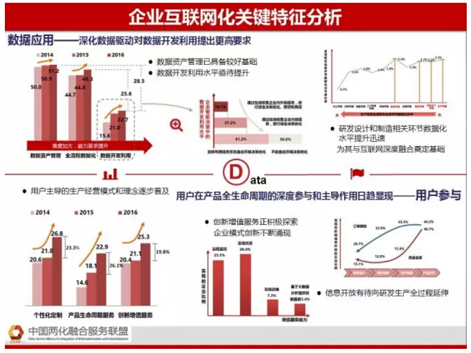 企业互联网化重点从数据应用、用户参与、组织创新、企业互联四个方面衡量它的互联网化的水平,2016年我国企业互联网化的指数32.7%,整体还处于较低的水平,第三季度增长较快。从四个方面来看,用户参与和组织创新是增长比较快的。