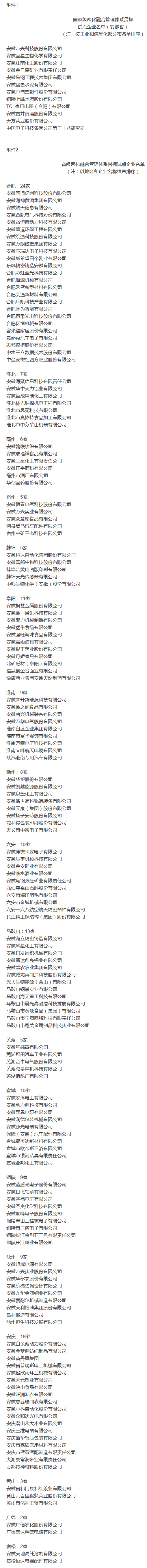 根据工业和信息化部两化融合管理体系贯标工作部署和《安徽省经济和信息化委员会关于安徽省信息化与工业化融合管理体系贯标工作的实施意见》(皖经信推〔2014〕203号)要求,我委组织开展了2016年国家级、省级两化融合管理体系贯标试点企业申报推荐工作。经企业自主申报、各市经信委推荐、专家评审等环节,工业和信息化部确定了安徽方兴科技股份有限公司等12家企业为国家级两化融合管理体系贯标试点企业(工信厅信软函〔2016〕359号),省经信委确定了安徽国通亿创科技股份有限公司等156家企业为省级两化融合管理体系贯标试点企业。现将国家级、省级两化融合管理体系贯标试点企业名单印发给你们,请各市经信委加强指导培训,各试点企业强化组织领导,按照贯标工作方案认真组织实施。