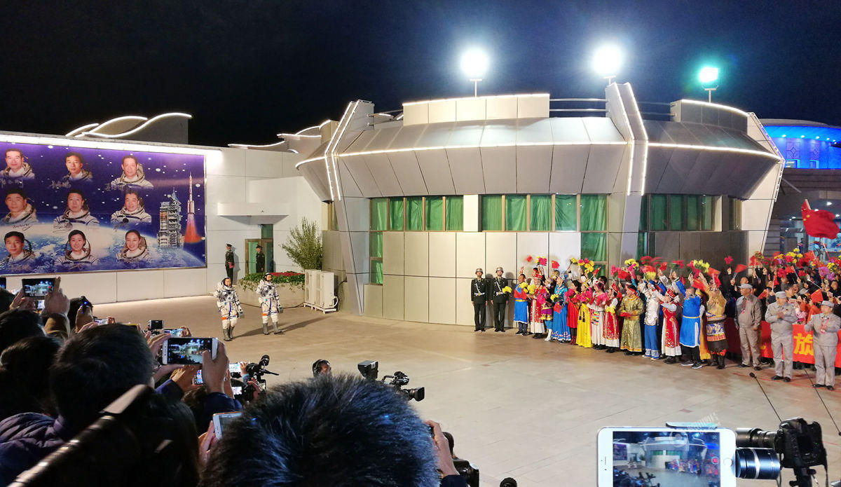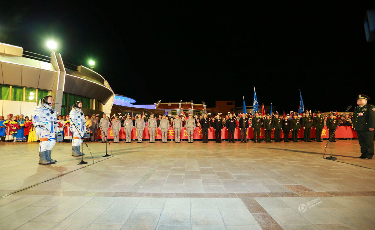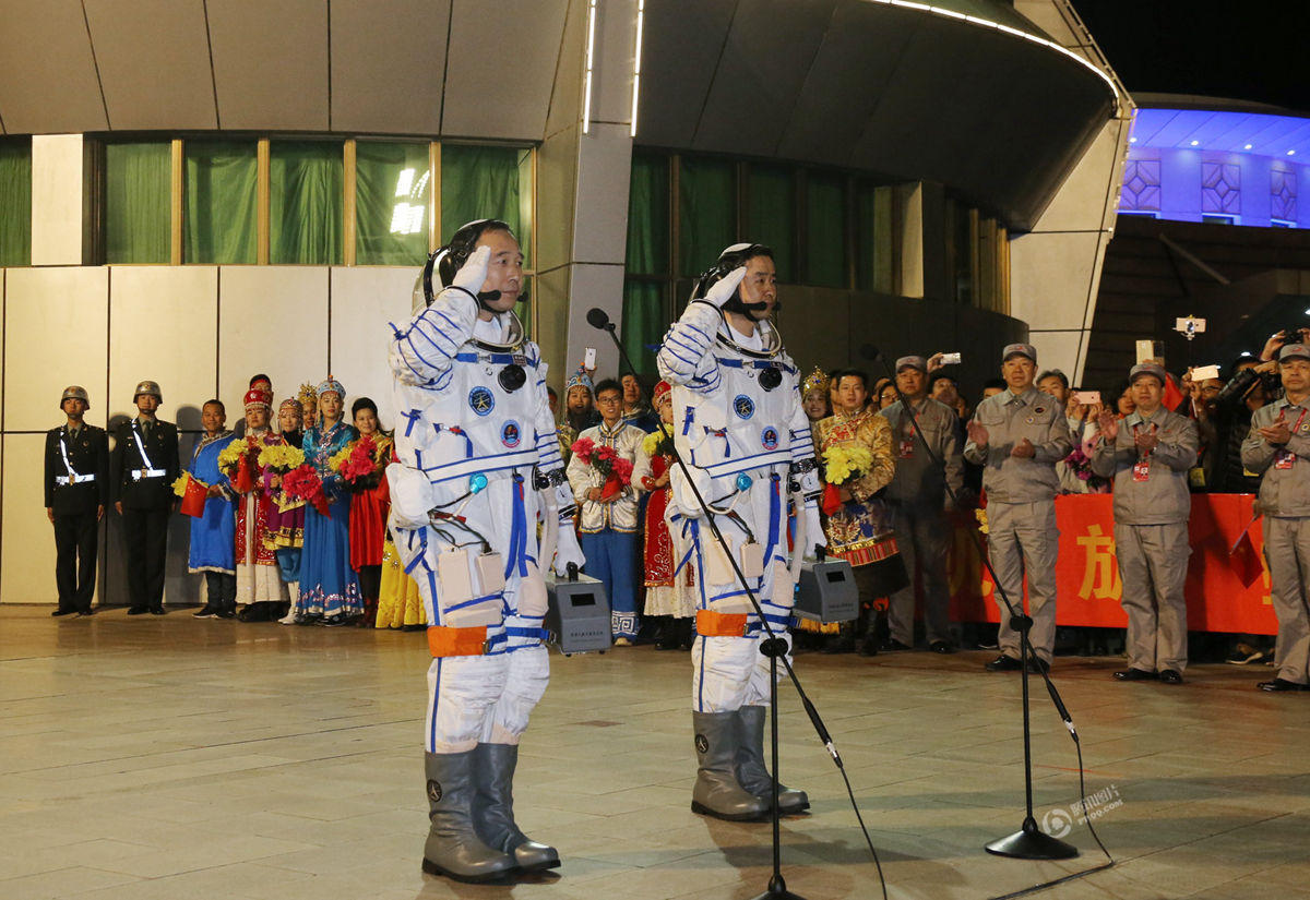 10月17日,神舟十一号航天员出征仪式在酒泉卫星发射中心举行。这是航天员景海鹏(左)、陈冬来到圆梦园广场。新华社记者 李刚 摄 (来自:中国日报网)