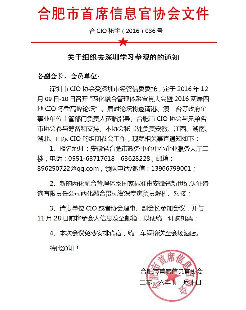 深圳市CIO协会受深圳市经贸信委委托,定于2016年12月09日-10日召开“两化融合管理体系宣贯大会暨2016两岸四地CIO冬季高峰论坛”。届时论坛将邀请港、澳、台等政府企事业单位主管部门负责人莅临指导。合肥市CIO协会与兄弟省市协会参与筹备和支持。本协会秘书处负责安徽、江西、湖南、湖北、山东CIO的组团参会工作,现就相关事宜通知如下: