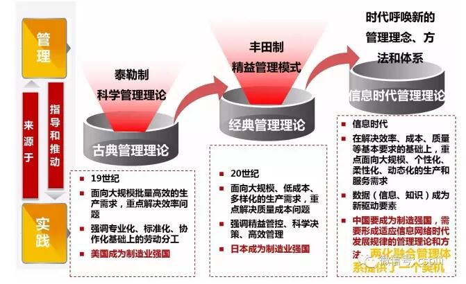 技术进步在引发产业变革的同时,总是伴随着管理理论和实践的重大变革。19世纪美国成为制造强国时,诞生了以福特制流水线为代表的古典管理理论;20世纪日本成为制造强国时,诞生了以丰田制精益管理为代表的经典管理理论。在当前工业社会向信息社会转型变革的重大战略机遇期,中国要成为制造业强国,同样也需要自己的管理理论和方法,两化融合管理体系提供了这样一个契机。