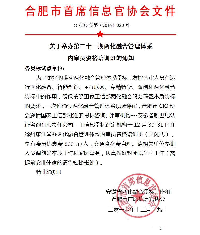 为了更好的推动两化融合管理体系贯标,发挥内审人员在运行两化融合、智能制造、+互联网、专精特新、双创和两化融合贯标中的作用,确保按照国家工信部两化融合服务联盟本质贯标的要求,一次性通过两化融合管理体系现场评审,合肥市CIO协会邀请国家工信部批准的贯标咨询、评审机构---安徽省新世纪认证咨询有限责任公司、工信部贯标评定机构于12月30-31日在滁州康佳举办两化融合管理体系内审员资格培训班(封闭式),享有会员优惠费800元/人,交通食宿费自理。请相关单位参训人员调剂好本质工作和家庭事务,认真做好封闭式学习工作(需提前安排住宿的请告知秘书处)。