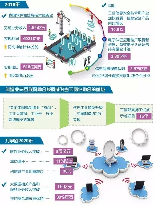2016年,我国软件和信息技术服务业完成业务收入4.9万亿元,实现利润6021亿元,同比均增长14.9%,实现出口519亿美元,同比增长5.8%。同时,工业信息安全技术和产业加快发展,信息安全产品同比增长10.9%,电子认证应用推广取得新进展,有效电子认证证书持有量合计达3.39亿张。信息消费规模达到3.9万亿元,对GDP增长直接贡献0.26个百分点。