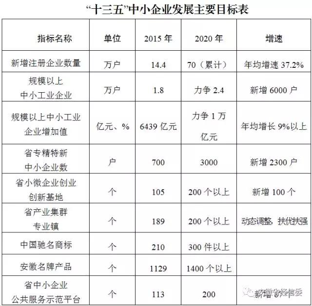 《规划》总结了“十二五”期间我省中小企业发展取得的成就和存在的问题,在分析中小企业发展面临的机遇和挑战的基础上,提出了“十三五”期间,全省新增注册企业70万户;到2020年,万人拥有企业数比2015年增长60%;规模以上中小工业企业增加值突破1万亿,年均增长9%以上;培育省专精特新中小企业3000家以上,“单打冠军”200个以上;中国驰名商标300件以上;安徽名牌产品1400个以上;主导制定国家和行业标准占全省的90%以上等目标。