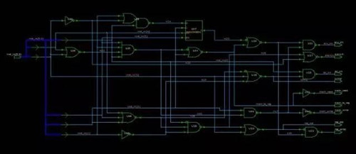 有了完整规画后,接下来便是画出平面的设计蓝图。在 IC 设计中,逻辑合成这个步骤便是将确定无误的 HDL code,放入自动化工具(EDA tool),让电脑将 HDL code 转换成逻辑电路,产生如下的电路图。之后,反覆的确定此逻辑闸设计图是否符合规格并修改,直到功能正确为止。