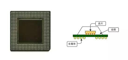 ▲ 左图为采用 BGA 封装的芯片。右图为使用覆晶封装的 BGA 示意图。(Source: 左图 Wikipedia)