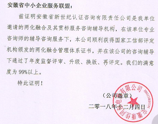 池州市弘港科技电子有限公司两化融合管理体系贯标责任人陈敏在收到两化融合评定机构寄来的证书后,感激万分,一年来的盼望都融入在与安徽省新世纪认证咨询有限公司老师的电话里,一是报喜,二是感谢,并表示推荐贵公司为有需要的客户做两化融合贯标辅导,你们的咨询质量和辅导水平是一流的。