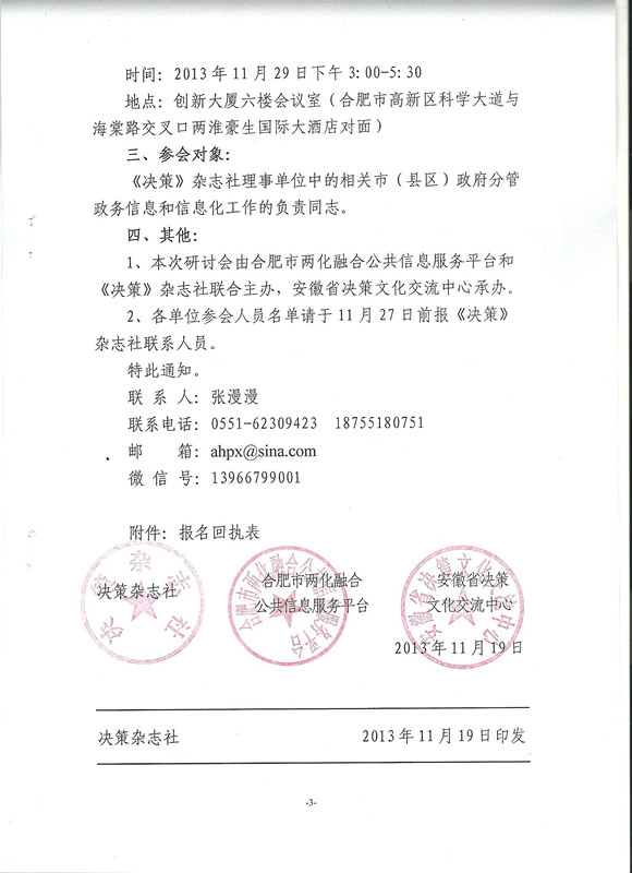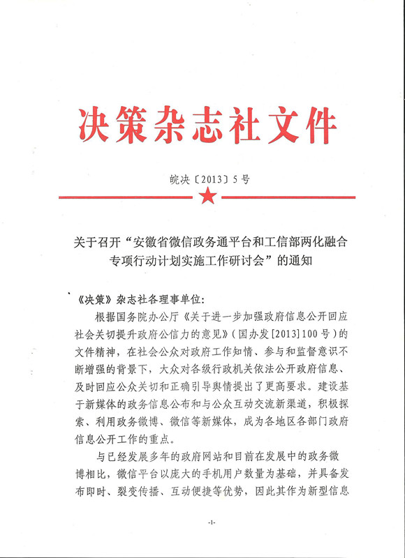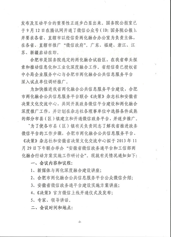为加快推进我市两化融合公共信息服务平台建设,推广微信政务通、微信服务等新媒体应用工作,促进两化深度融合,安徽省《决策》杂志社、安徽省决策文化交流中心、合肥市两化融合公共信息服务平台将联合召开“微信政务通平台和工信部‘两化深度融合专项行动计划’实施工作”研讨会,现将有关事项通知如下: