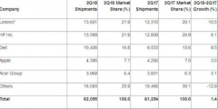 7月13日消息,据外媒报道,市场研究公司Gartner公布的初步数据显示,2018年第二季度全球PC出货量总计达到6210万台,较2017年第二季度增长1.4%。这是自2012年第一季度以来,全球PC......
